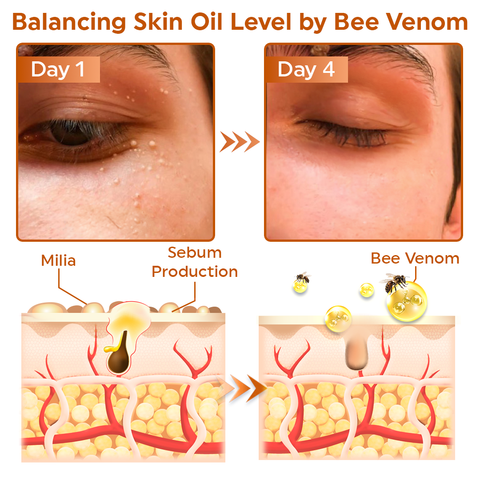 Bee venom can help normalize oil production in the skin通过调节皮脂水平来滋润眼周, thereby reducing the likelihood of clogged pores and avoiding milia in this delicate area. Bee venom can promote a balanced skin environment, helping to reduce existing milia and prevent their future formation , resulting in smoother, clearer skin around the eyes.